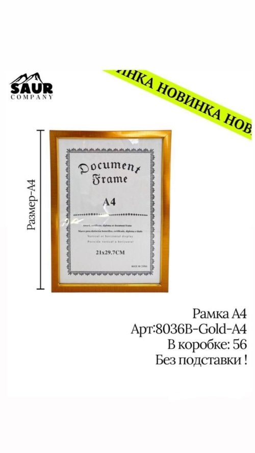 №8036B - gold Рамка А4 арт.8036B - Gold Стильная золотая рамка придаст элегантность и солидность вашим документам. Подходит для размещения дипломов, сертификатов, наград и других важных бумаг в офисах, учебных заведениях и дома.