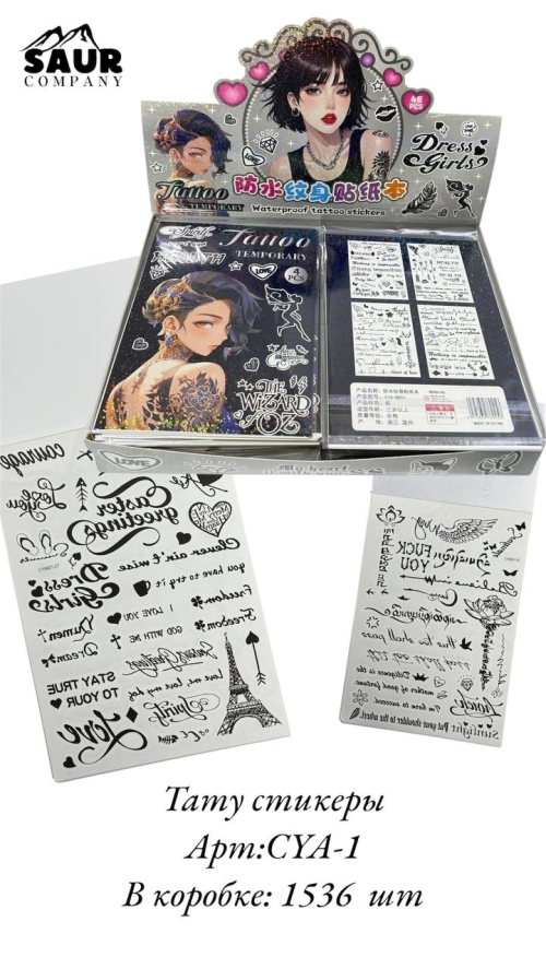 №CYA-1 Тату-наклейка арт.CYA-1 Добавьте яркости и индивидуальности своему образу с водостойкими временными тату-наклейками! В комплекте представлены стильные дизайны, включая надписи, символы и иллюстрации, которые подойдут для любого случая.