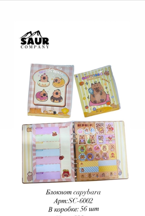 №SC-6002 Блокнот Очаровательный блокнот с милой капибарой на обложке — идеальный спутник для учёбы, работы или творчества. Яркий и забавный дизайн поднимает настроение, а удобный формат делает его отличным выбором для ежедневных записей, заметок или ведения дневника.