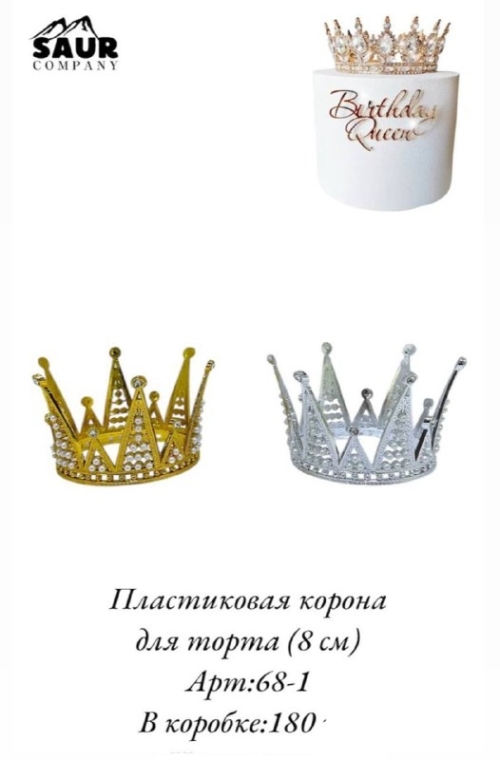 №68-1 Пластиковая корона для торта Пластиковая корона для торта — декоративный аксессуар из прочного и легкого пластика, предназначенный для украшения праздничных тортов. Корона выполнена с аккуратными деталями и блестящей поверхностью, что придаёт торту праздничный и нарядный вид. Идеально подходит для дней рождения, юбилеев и других торжеств. Легко устанавливается на верхушку торта и безопасна в использовании.