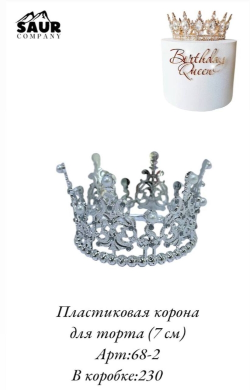 №68-2 Пластиковая корона для торта Пластиковая корона для торта — декоративный аксессуар из прочного и легкого пластика, предназначенный для украшения праздничных тортов. Корона выполнена с аккуратными деталями и блестящей поверхностью, что придаёт торту праздничный и нарядный вид. Идеально подходит для дней рождения, юбилеев и других торжеств. Легко устанавливается на верхушку торта и безопасна в использовании.