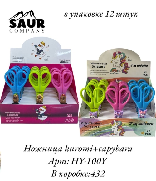 №HY-100Y Ножницы с дизайном Яркие и удобные детские ножницы с забавным дизайном любимых персонажей — Куromи и Капибара. Эргономичные пластиковые ручки обеспечивают комфортное использование и безопасны для детей. Идеально подходят для творчества, учебы и работы с бумагой дома или в школе. Острые, но безопасные лезвия позволяют легко и аккуратно резать бумагу, картон и другие материалы.