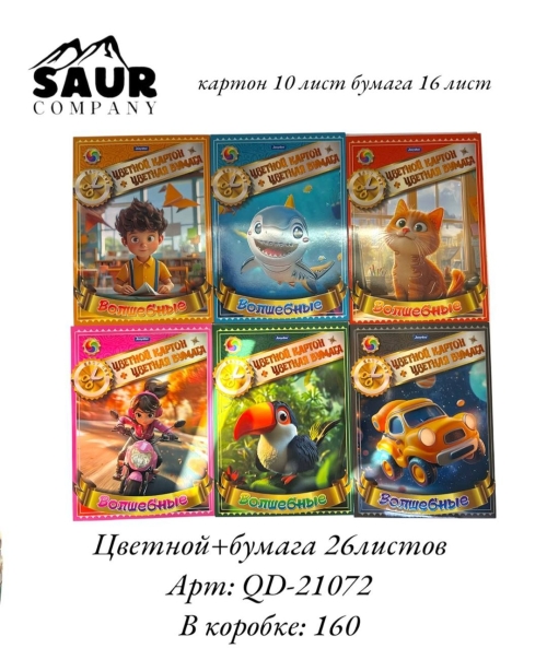 №QD-21072 Набор: цветная бумага и картон Набор для творчества, включающий 16 листов цветной бумаги и 10 листов цветного картона. Отлично подходит для аппликаций, поделок, оформления и учебных занятий. Яркие цвета, удобный формат — всё, что нужно для вдохновения и творчества детей и взрослых.