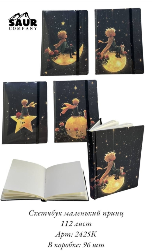 №2425К Скетчбук Скетчбук с атмосферной обложкой по мотивам сказки «Маленький принц». Подходит для рисунков, зарисовок, заметок и творчества. Плотные листы выдерживают маркеры, карандаши, ручки и линеры. Компактный формат удобно брать с собой — для вдохновения в любом месте.