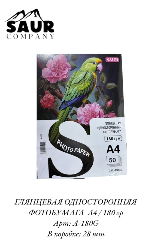 №А-180G Фотобумага глянцевая односторонняя А4, 180 г/м² Односторонняя глянцевая фотобумага формата A4 с плотностью 180 г/м². Обеспечивает яркую и чёткую передачу цветов, идеальна для печати фотографий, изображений и рекламных материалов. Совместима со струйными принтерами. Гладкая блестящая поверхность придаёт отпечаткам насыщенность и профессиональный вид.
