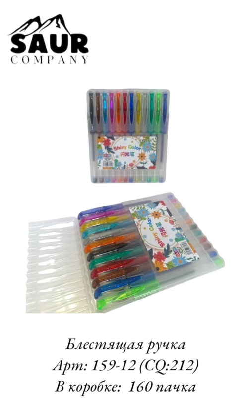 №159-12 (CQ:212) Блестящие ручки арт.159-12 (CQ:212) Блестящие ручки — яркие гелевые ручки с блестками для украшения записей, рисунков и открыток. Пишут плавно, создают эффект мерцания. Идеальны для творчества.