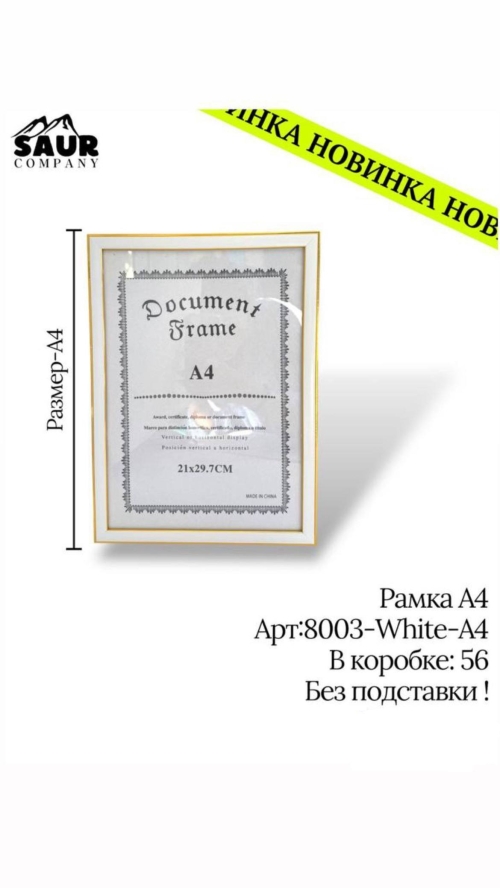 №8003-White-A4 Рамка А4 арт.8003-White Рамка А4 — классическая рамка для фото, дипломов и сертификатов формата A4 (21×29,7 см). Подходит для настенного или настольного размещения.