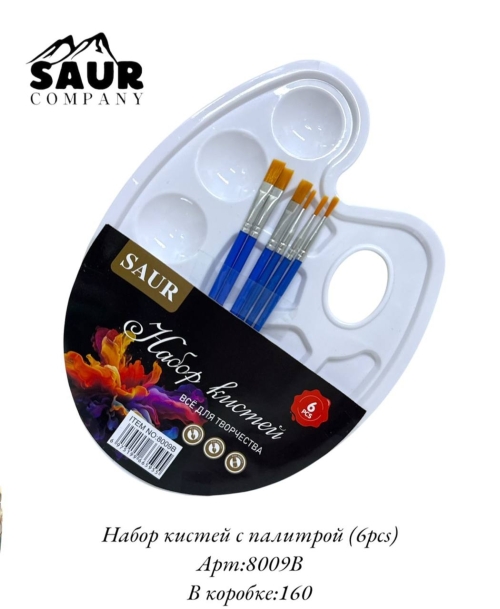 №8009В Набор кистей с палитрой Набор кистей с палитрой, 6 штук — практичный комплект для творчества. Включает 6 кистей разных размеров и палитру для смешивания красок. Подходит для акварели, гуаши и акрила.