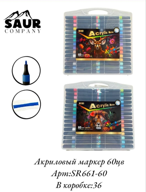 №SR661-60 Набор акриловых красок, 60 цветов Большой набор акриловых красок включает 60 ярких и насыщенных оттенков для творчества и хобби. Краски обладают высокой укрывистостью, легко наносятся, быстро сохнут и образуют прочное покрытие. Подходят для рисования на бумаге, холсте, дереве, ткани, керамике и других поверхностях.
