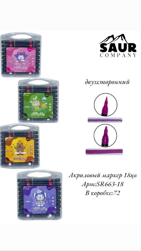 №SR661-18 Набор акриловых маркеров, 18 цветов Набор акриловых маркеров включает 18 ярких и стойких цветов, идеально подходящих для рисования, скетчинга, декора и оформления различных поверхностей. Маркеры пишут на бумаге, дереве, стекле, камне, ткани, металле и пластике. Чернила быстро сохнут, не растекаются и не выгорают со временем.