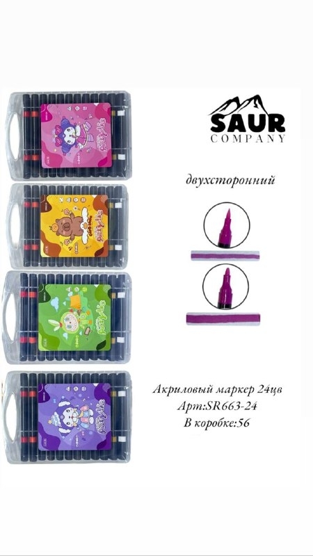 №SR663-24 Набор акриловых маркеров, 24 цветов Набор акриловых маркеров включает 24 ярких и стойких цветов, идеально подходящих для рисования, скетчинга, декора и оформления различных поверхностей. Маркеры пишут на бумаге, дереве, стекле, камне, ткани, металле и пластике. Чернила быстро сохнут, не растекаются и не выгорают со временем.