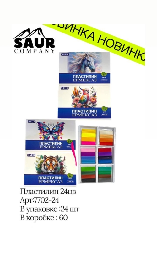 №7702-24 Пластилин, 24 цвета арт.7702-24 Универсальный набор пластилина из 24 ярких и насыщенных цветов идеально подойдёт для детского творчества, школьных занятий и домашних поделок. Пластилин мягкий, легко мнётся, не липнет к рукам и безопасен для детей.