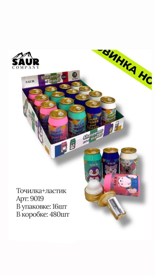 №SR-9019 Точилка с ластиком 2 в 1, арт.SR-9019 Точилка в банке — оригинальная точилка для карандашей в виде яркой баночки с забавными персонажами, с встроенным ластиком и контейнером для стружки. Артикул: SR-9019. В коробке: 480 шт.