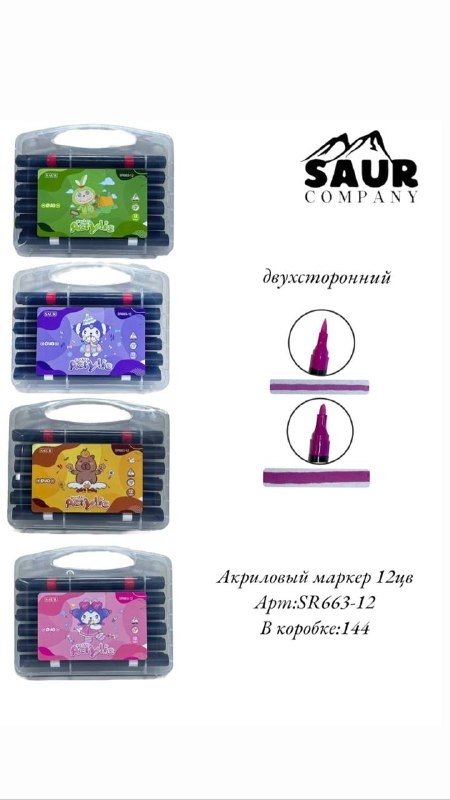 №SR663-12 Акриловый маркер, 12 цв. арт. SR663-12 Акриловый маркер, 12 цветов, арт. SR663-12, в коробке 144 шт. Набор акриловых маркеров с 12 яркими цветами для творчества и рисования. Подходит для бумаги, картона, дерева и других поверхностей. Удобный корпус и насыщенные оттенки обеспечивают аккуратное и точное нанесение цвета.