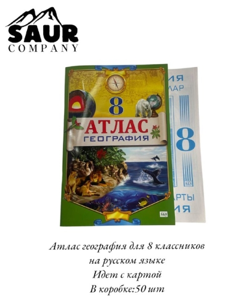 Атлас по географии для 8 класса на русском языке с контурной картой. В коробке 50 шт.