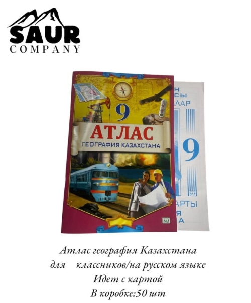 Атлас по географии для 9 класса на русском языке с контурной картой. В коробке 50 шт.