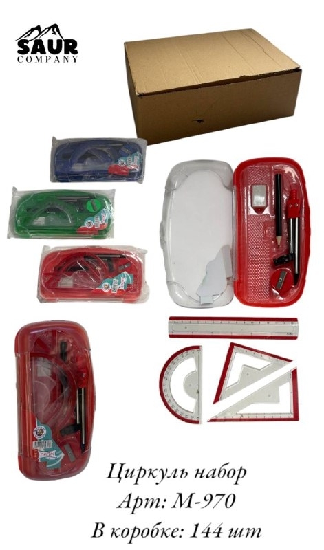 Комплект для черчения с циркулем артикул М-970. Подходит для школьных и офисных занятий. В коробке 144 шт.