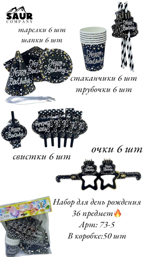 №73-5 Набор для дня рождения, 36 предметов Полный комплект аксессуаров для празднования дня рождения. Включает декоративные элементы и мелкие предметы для создания праздничной атмосферы, подходит для вечеринок.