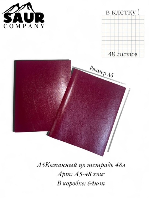 №А5-48 Тетрадь кожаная цветная А5, 48 листов. Тетрадь кожаная цветная формата А5, 48 листов. Компактная и удобная для учебы, работы или личных записей. Обложка из кожаного материала придает изделию прочность, износостойкость и стильный внешний вид, а качественная бумага обеспечивает комфортное письмо. Артикул А5-48. В коробке – 64 шт.
