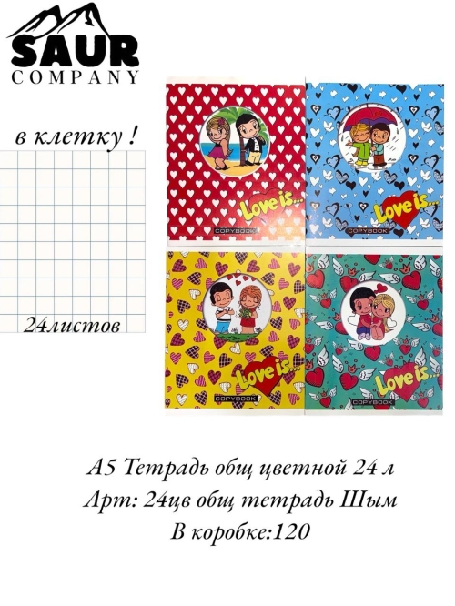 №А5-24 Тетрадь Love is А5, 24 л. Тетрадь общая формата А5, 24 листа, из серии Love is. Яркий цветной дизайн обложки с романтическими иллюстрациями делает тетрадь привлекательной и оригинальной. Подходит для школьных занятий, записей и заметок. Внутренний блок из качественной бумаги обеспечивает удобное письмо. В коробке – 120 шт.