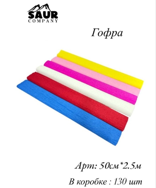 №50 см × 2,5 м Гофрированная бумага 50 см × 2,5 м Гофрированная бумага, артикул 50 см × 2,5 м. Прочный и гибкий материал для творчества, упаковки и декоративных изделий. Легко принимает форму, подходит для поделок, оформления подарков и букетов. В коробке – 130 шт.
