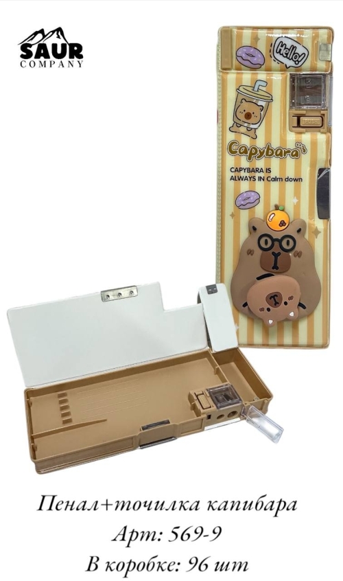 №569-9 Пенал с точилкой, арт.569-9. Пенал с точилкой, артикул 569-9. Удобный и практичный аксессуар для хранения ручек, карандашей и других школьных принадлежностей. Встроенная точилка позволяет быстро подточить карандаши в любой момент. Прочный и компактный, легко помещается в школьный рюкзак. В коробке – 96 шт.