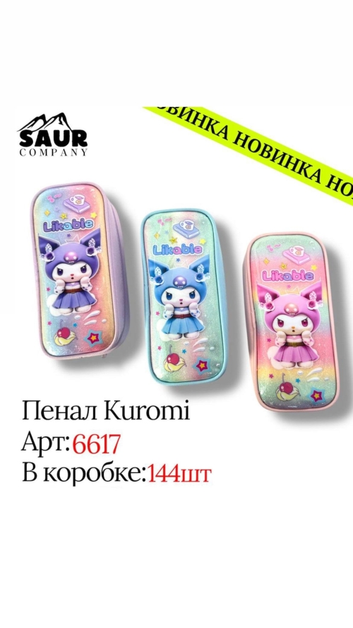 №6617 Пенал Kuromi арт.6617 Стильный пенал с дизайном популярного персонажа Kuromi. Вместительный и удобный для хранения ручек, карандашей и других школьных принадлежностей. Выполнен из прочного материала, станет ярким аксессуаром для школы и подарком для поклонников персонажа.