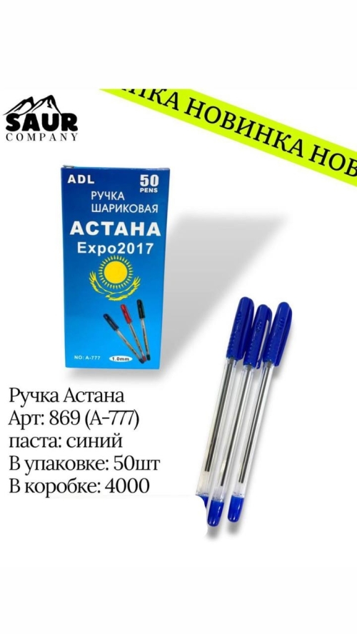 Ручка Астана Артикул: 869 (А-777) Цвет пасты: синий Упаковка: 50 шт в упаковке, 4000 шт в коробке ✅