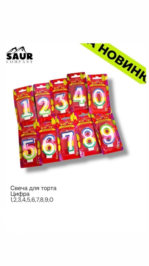 №0–9 Свечи-цифры (0–9) Набор декоративных свечей для торта — цифры 0,1,2,3,4,5,6,7,8,9. Подходят для праздников, дней рождения и юбилеев. Безопасные фитили, изготовлены из воска/парафина, плотно держатся в торте. Доступны в вариантах: разноцветные.