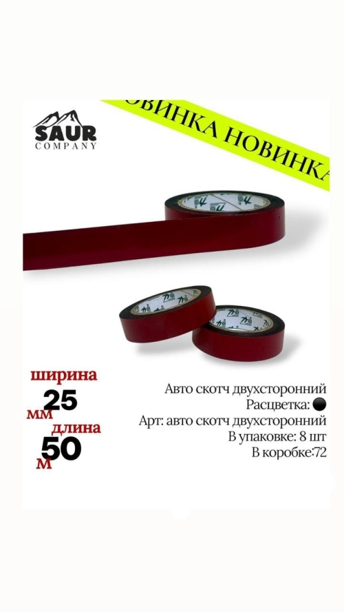 Авто скотч двусторонний Ширина: 25 мм Длина: 50 м Расцветка: чёрный ⚫ Артикул: авто скотч двусторонний В упаковке: 8 шт В коробке: 72 шт