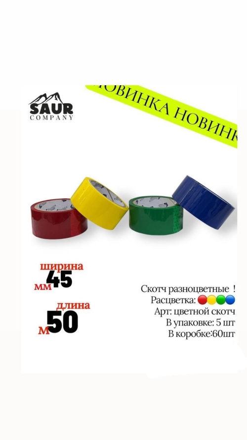 Скотч разноцветный. Расцветка — красный, жёлтый, зелёный, синий. В упаковке — 5 шт, в коробке — 60 шт. 🎨📦