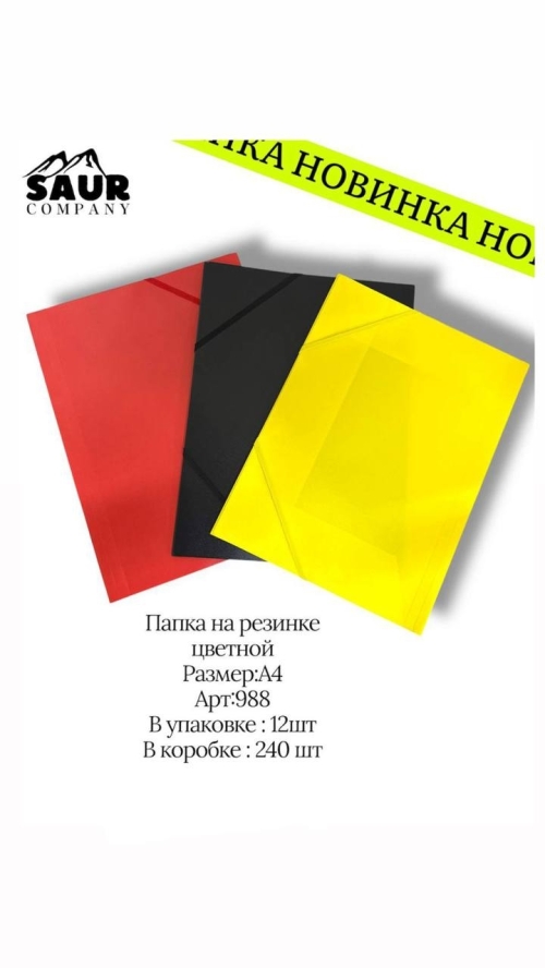 Папка на резинке, цветная, размер А4, артикул 988. В упаковке — 12 шт, в коробке — 240 шт.