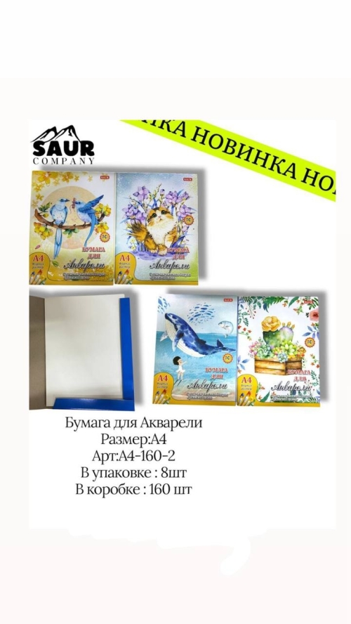 Бумага для акварели, размер А4, артикул А4-160-2. В упаковке — 8 шт, в коробке — 160 шт.