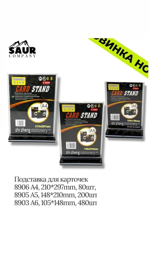 №8905 Подставка для карточек A5 арт.8905 Подставка для карточек, артикул 8905, размер 148×210 мм — удобное решение для размещения информационных материалов, карточек, ценников и рекламных объявлений. Изготовлена из прочного прозрачного пластика, что обеспечивает хорошую видимость содержимого и долговечность в использовании. Подходит для офисов, магазинов, выставок и мероприятий.