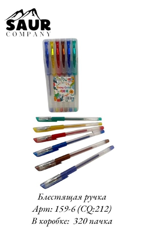 №159-6 (CQ:212) Блестящие ручки, 6 цв. арт. 159-6 (CQ 212) Блестящие ручки — яркие гелевые ручки с блестками для украшения записей, рисунков и открыток. Пишут плавно, создают эффект мерцания. Идеальны для творчества.