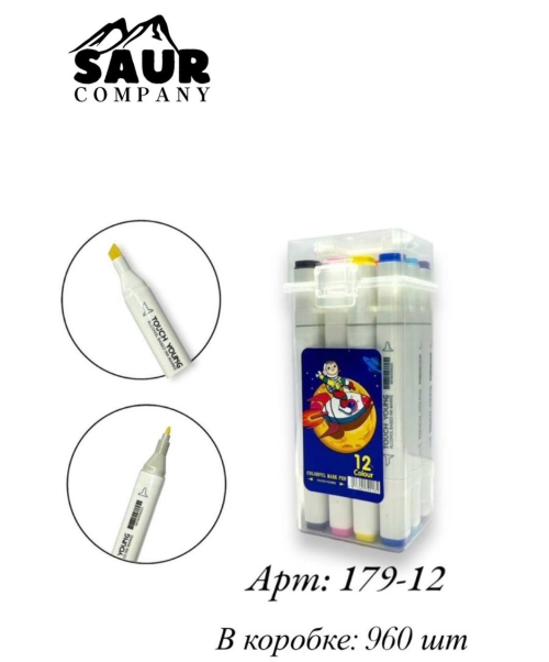 №179-12 Двухсторонние маркеры Touch арт.179-12 Профессиональные двухсторонние маркеры Touch с пулевидным и скошенным наконечниками. Подходят для скетчинга, иллюстраций, дизайна и черчения. В наборе 12 насыщенных, стойких цветов. Чернила на спиртовой основе, быстро сохнут и не растекаются. Удобный эргономичный корпус и прочная упаковка — идеальны как для начинающих, так и для профессионалов.